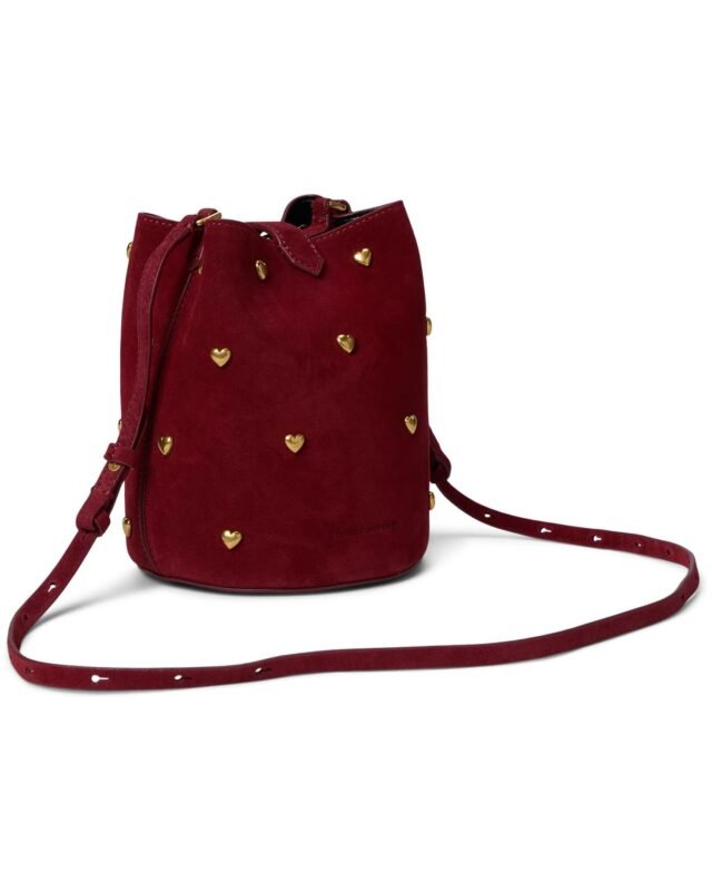 - Not your average bucket bag, the Rebecca Minkoff™ Small Heart Bucket is crafted from beautiful suede leather and features heart studs throughout. Carry it effortlessly by its long strap over your shoulder, or as a crossbody. Featuring magnetic snap closure, adjustable strap, one pockets, and two compartments.