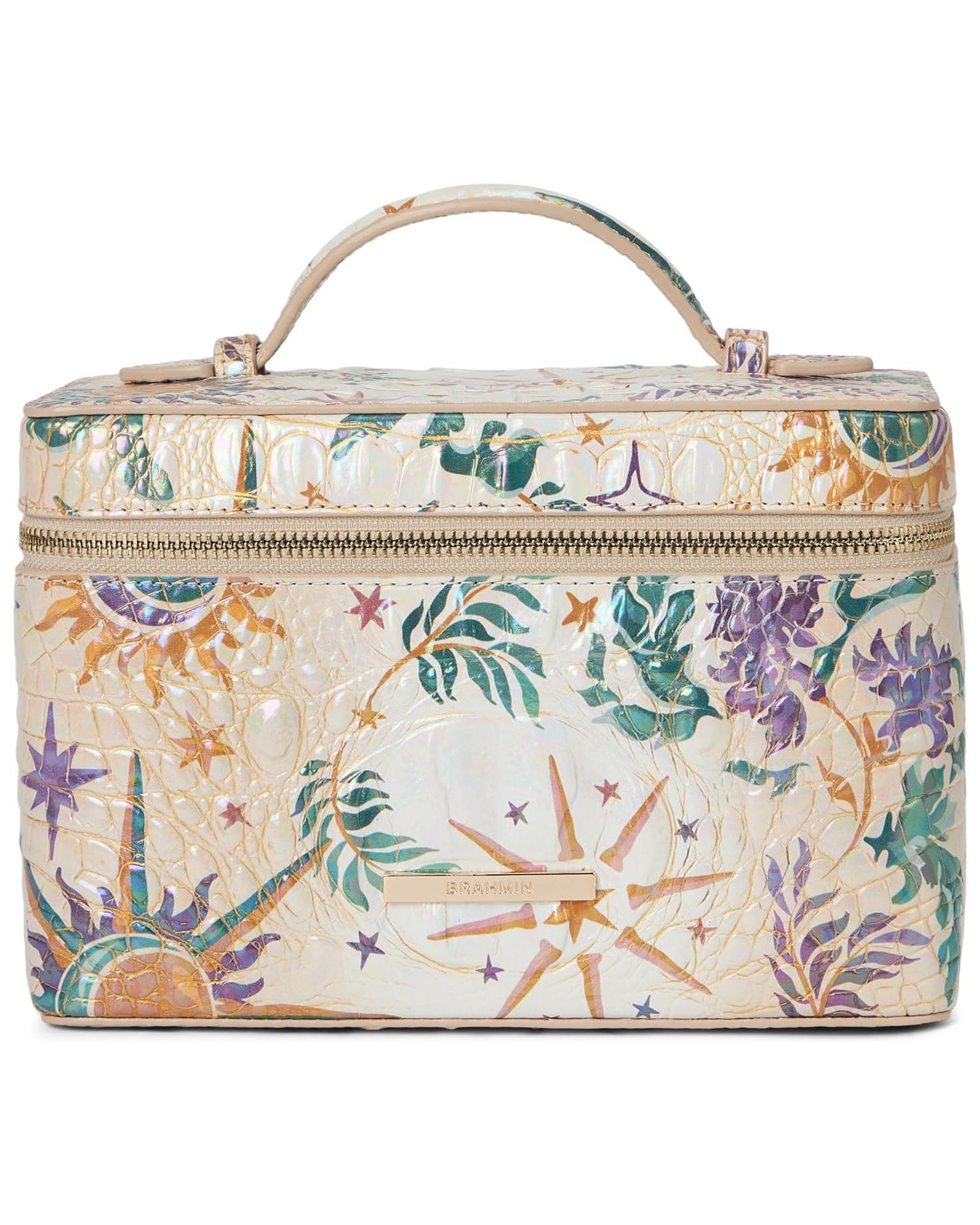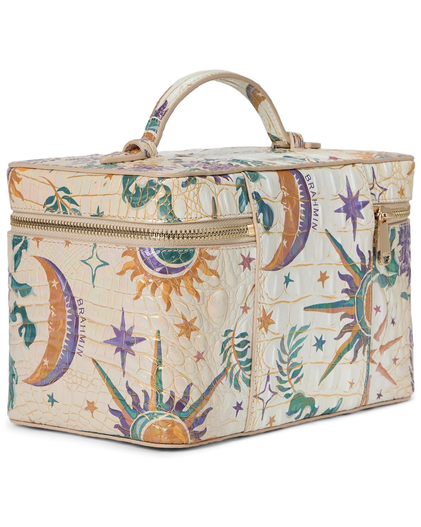 - Unleash your inner fashionista by carrying the striking Brahmin® Charmaine travel makeup bag. Crafted with genuine leather construction, it is finished with a charming shimmering silver that radiates elegance and sophistication. With its zippered closure, your belongings remain secure and easily accessible. This structured train case offers plenty of space for your cosmetics and toiletries. Store foundation, blush, powder, mascara, wipes, and more.